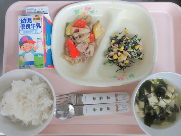 本日の給食は「ごはん、根菜の酢豚風、ひじきサラダ、牛乳、豆腐とわかめのスープ」です。
