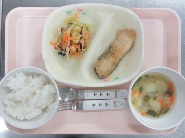 本日の給食は「ごはん、カレイの照り焼き、厚揚げの野菜炒め、じゃがいもとわかめのみそ汁」です。