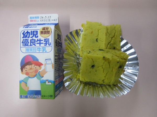 おやつは「牛乳、かぼちゃのもちもちケーキ(手作り)」です。